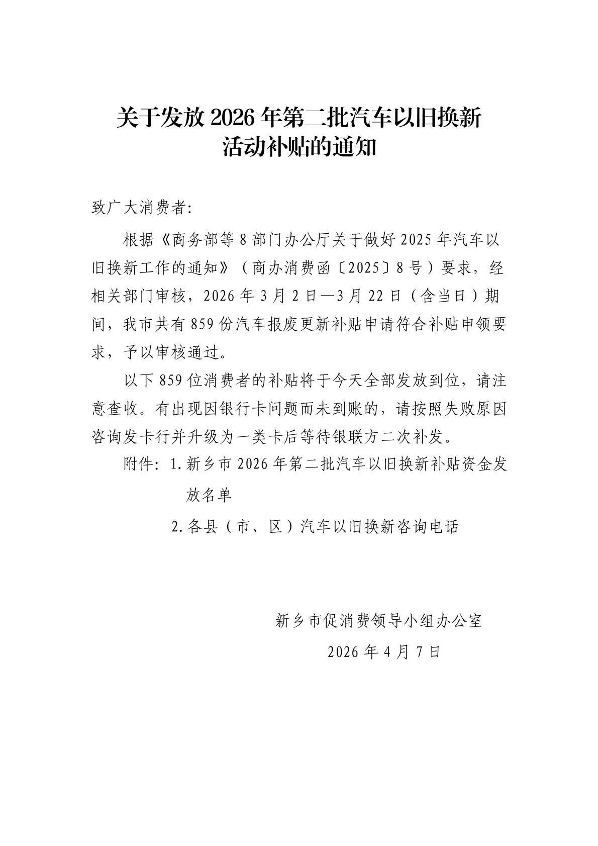 关于发放2026年第二批汽车以旧换新活动补贴的通知
