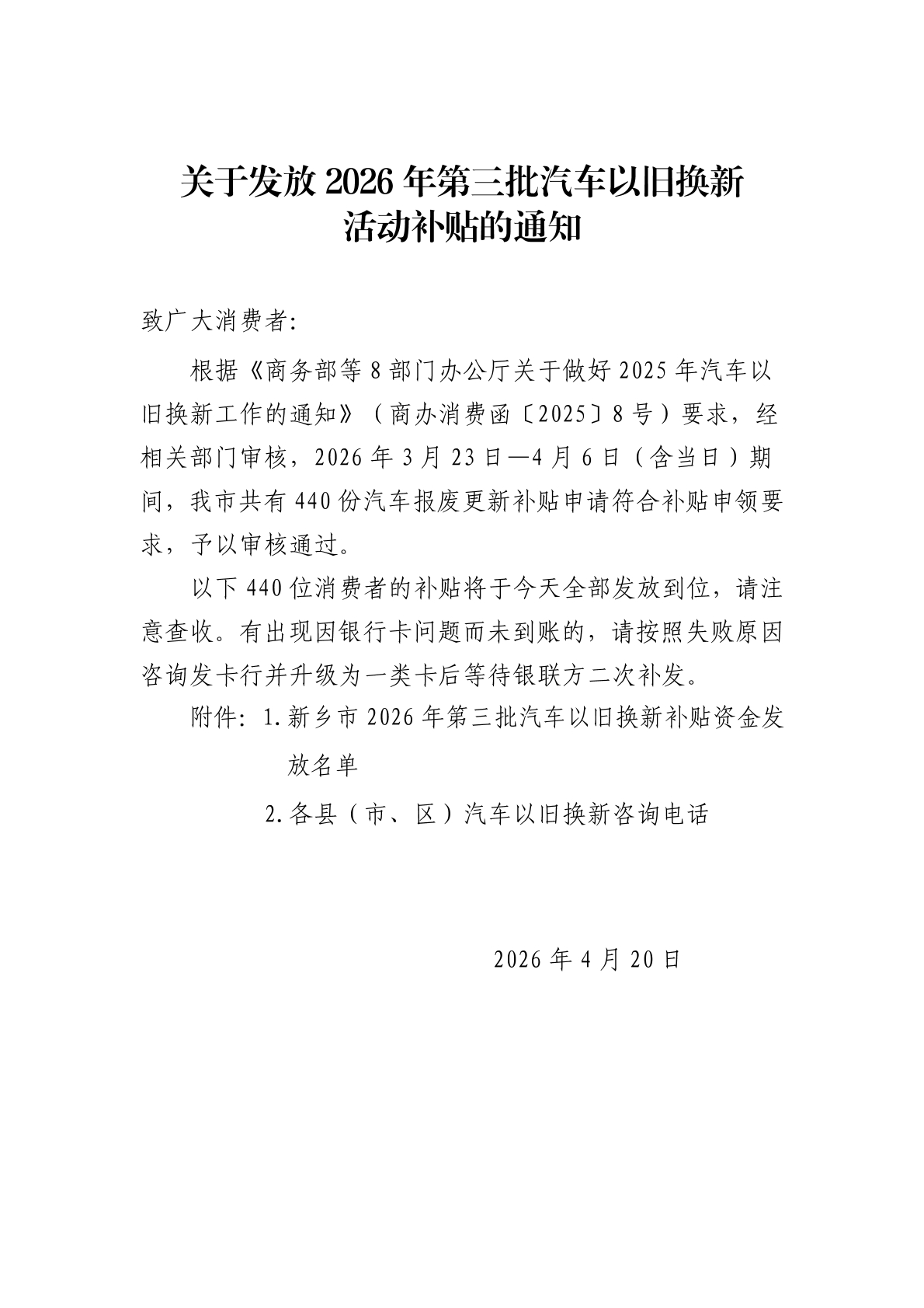 关于发放2026年第三批汽车以旧换新活动补贴的通知