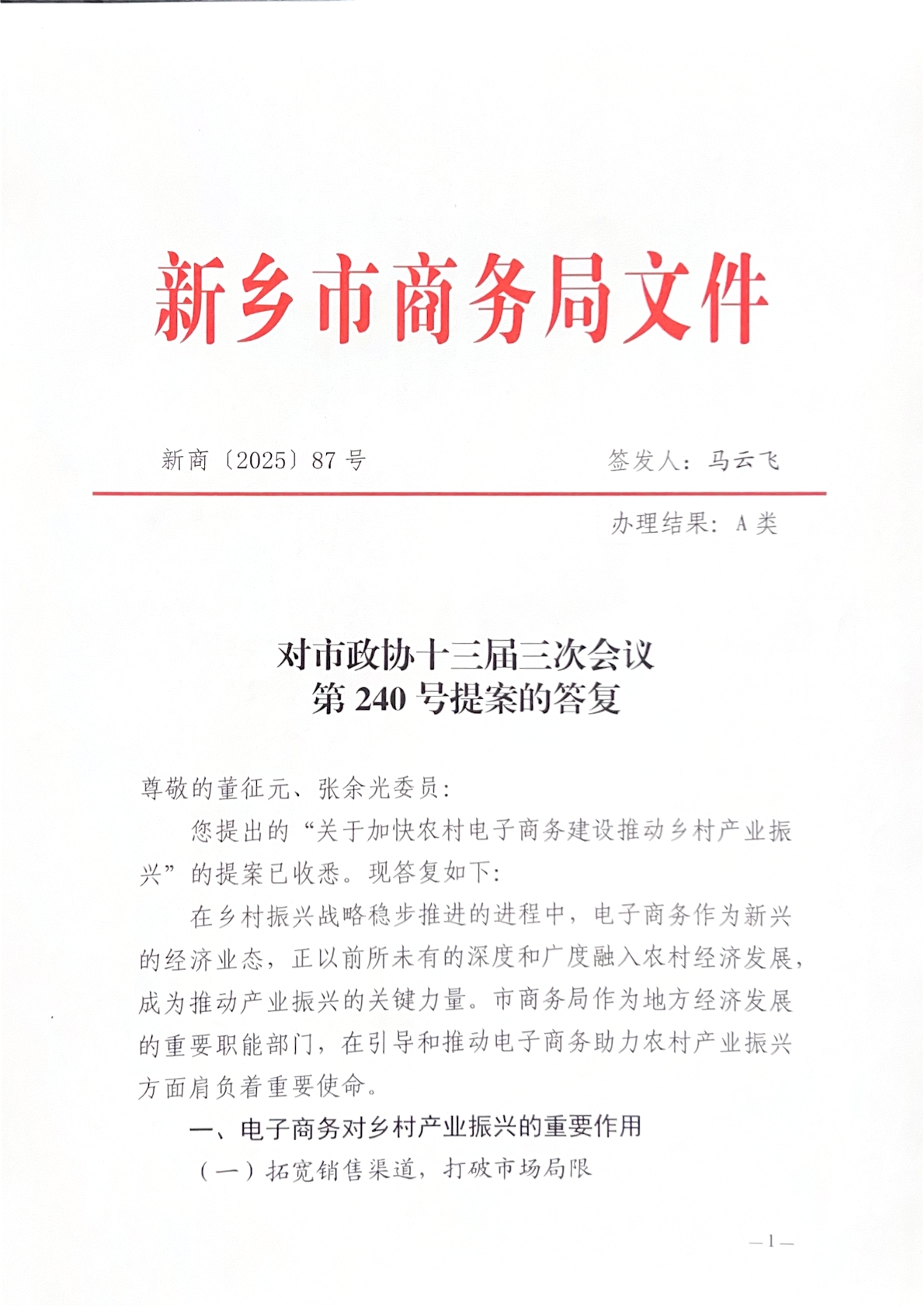 新乡市商务局对市政协十三届三次会议第240号提案的答复