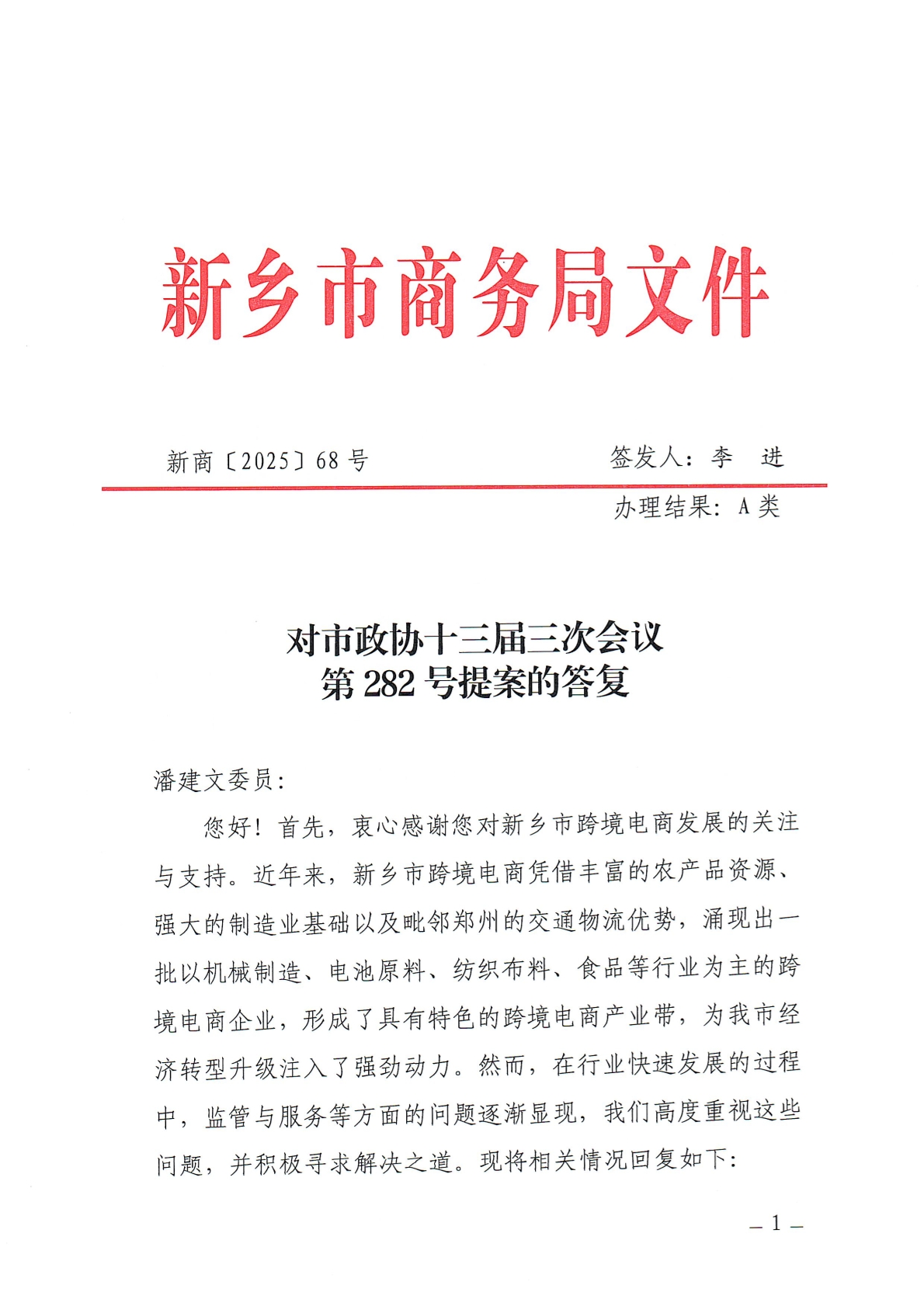 新乡市商务局对市政协十三届三次会议第282号提案的答复