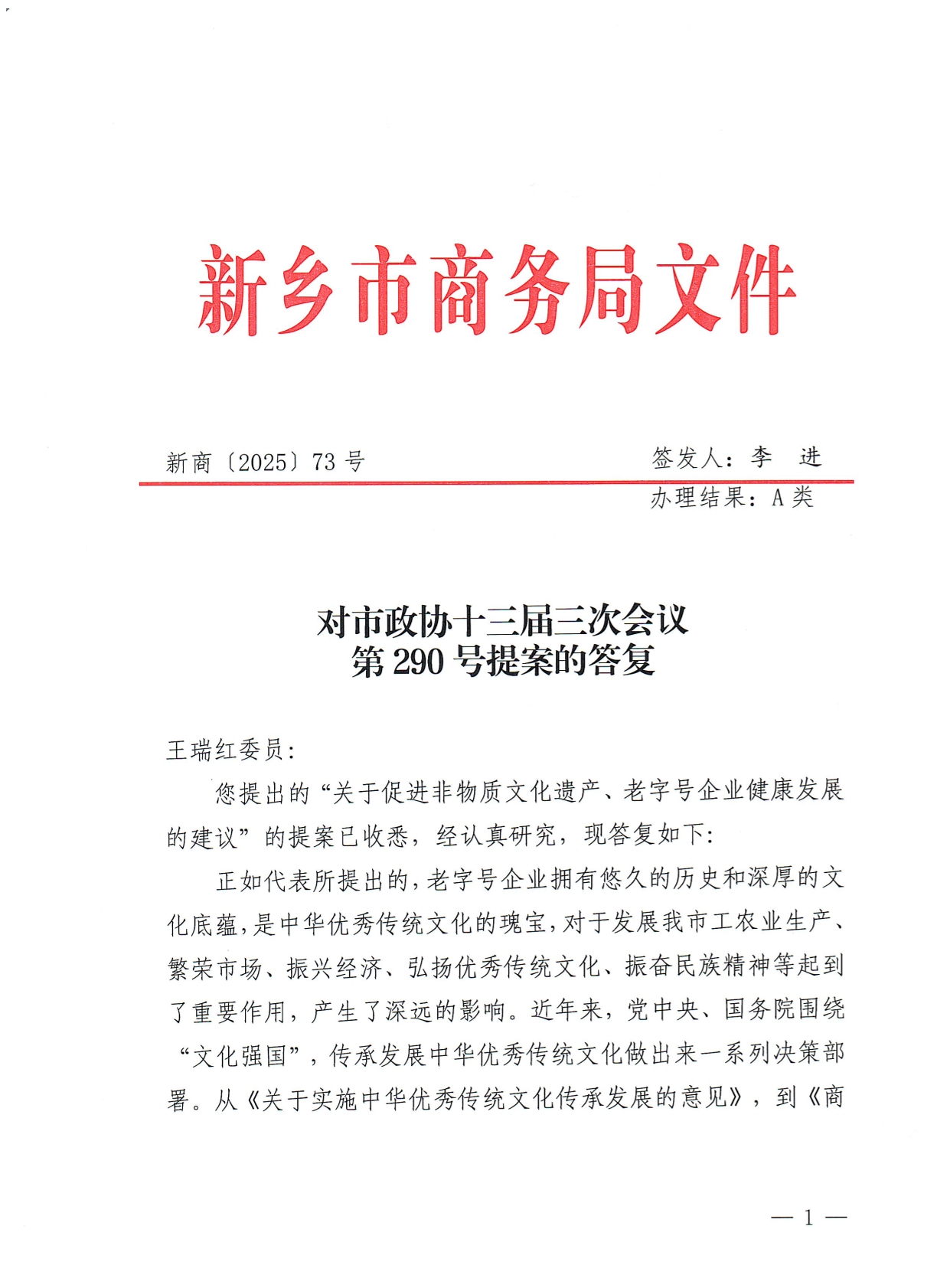新乡市商务局对市政协十三届三次会议第290号提案的答复